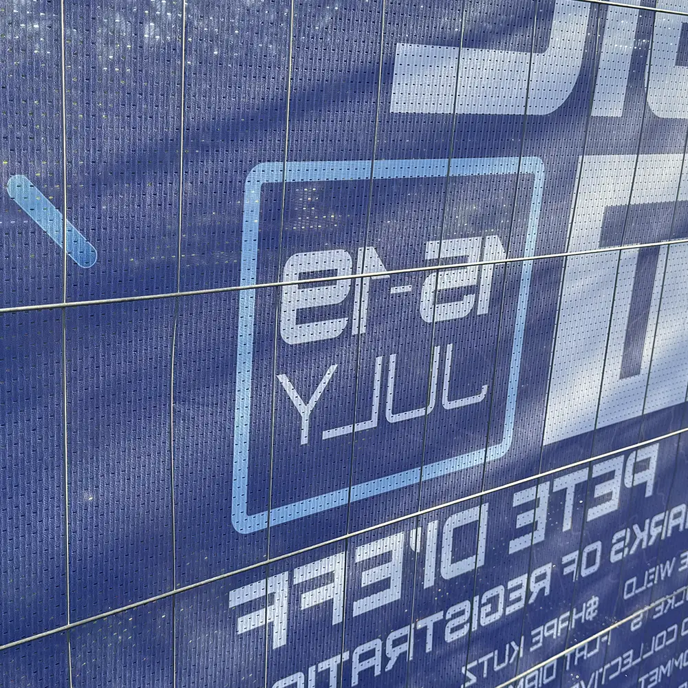 At 105gsm, AirMesh Polyester is incredibly lightweight, making handling and deployment easier for end users and fitters. As an example, a full 3375mm × 1780mm Heras Fencing Banner on AirMesh Polyester weighs 0.8kg, compared to around 1.9kg for a PVC-based equivalent – this can make a huge difference for longer/larger installations. Despite the lighter weight, the 100% polyester makeup of the material and industry-machine sewn hems result and a very strong fabric, that coupled with its airflow qualities, create a finished product that will last.